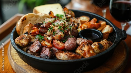 Gourmet meat and cheese platter with fresh bread, garlic dip, tomatoes, and wine on a wooden table setting