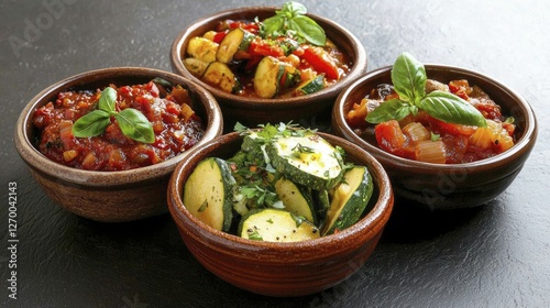 Gourmet one-pot meals with vibrant vegetables simmering in rich sauces, garnished with fresh herbs, and served in rustic ceramic bowls.