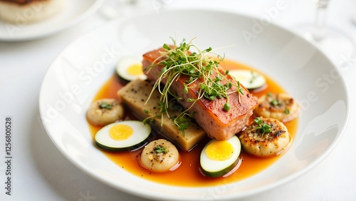 Gourmet Pork Belly Dish with Quail Eggs and Zucchini