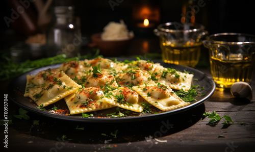 Gourmet Ravioli Pasta Sprinkled with Cheese and Herbs Served on Rustic Table with Whiskey