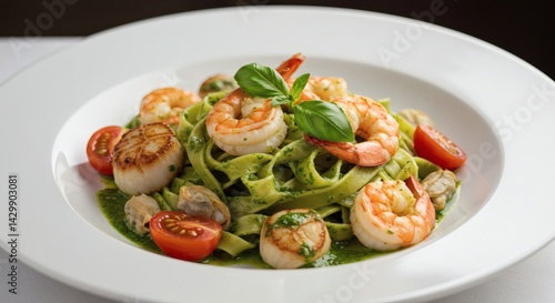 Gourmet seafood pasta dish with shrimp and scallops on white plate