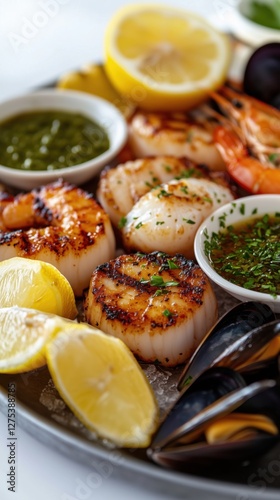 Gourmet seafood platter with grilled tiger prawns, scallops, mussels, lemon wedges, and herbs