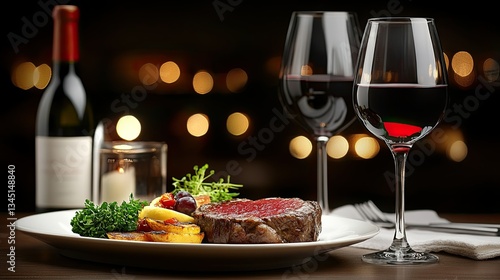 Gourmet Steak Dinner with Red Wine and Elegant Table Setting Under Soft Candlelight