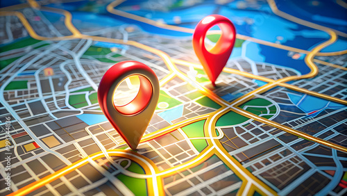GPS Navigation Map with Vibrant Pins and Neon Light. Perfect for: Travel expos, Navigation app promotions, Route planning workshops