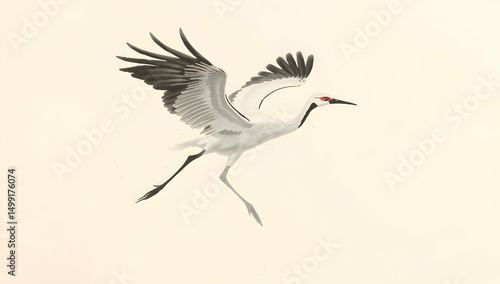 Graceful crane in flight with fluid brushstrokes and tranquil composition.