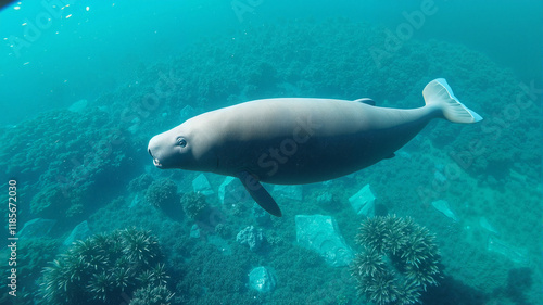 Graceful dugong swimming in clear blue ocean water over seagrass