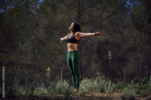 Graceful Hispanic woman meditating in mountains with closed eyes