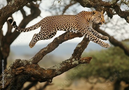Graceful Leopard in Mid-Flight Leaping Through Tree Branches in Natural Habitat of African Savanna