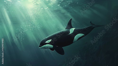 Graceful orca swimming underwater in sunlit ocean. Powerful and intelligent marine predator.