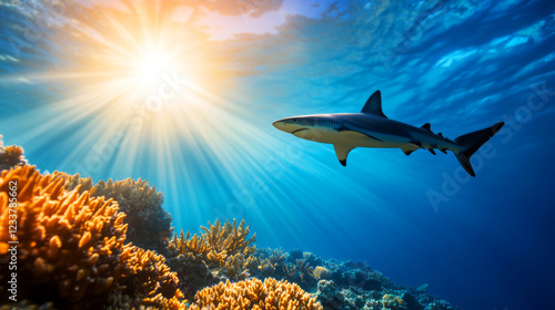 Graceful Shark Swimming Through Vibrant Coral Reef Under Bright Sunlight in Ocean Waters