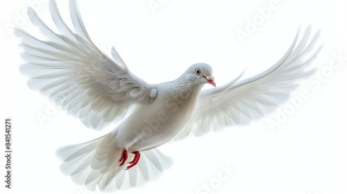 Graceful white dove soaring against a clear white sky, symbol of purity and tranquility