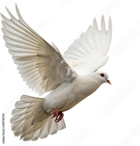 Graceful white dove soaring mid-flight, symbol of peace and freedom, capturing pure serenity.