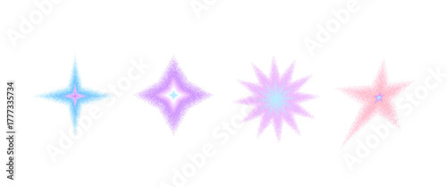 Gradient grain y2k starburst pastel colors figures. Twinkles halftone grainy shapes purple, pink set. Vector bling, blink sparkles graphic figures icons isolated on white background. Star y2k element.