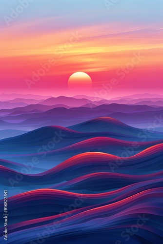 Gradient hills, vibrant sunset colors, smooth curves, dreamy atmosphere