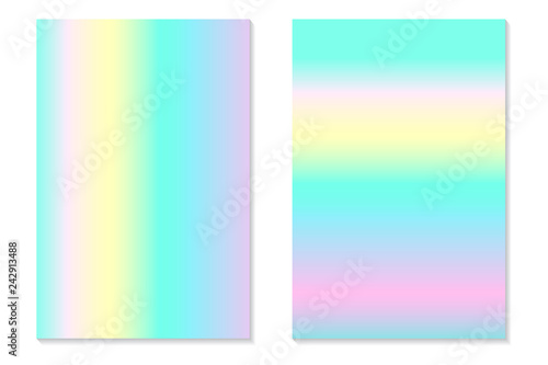 Gradient Hologram Backgrounds. Set of colorful holographic posters in retro style. Vibrant neon pastel texture. Vector gradient template for flyer, banner, mobile screen.