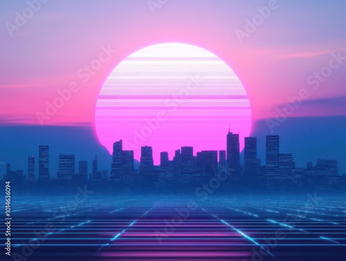 Gradient sunset, neon city silhouette, holographic glow, futuristic landscape