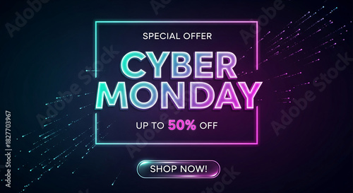 Gradient text "Cyber Monday" framed by neon square with particle bursts, suggesting a special offer and shop now button, representative of sale event