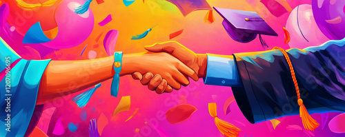 graduate shaking hands with school official, celebrating achievement with colorful confetti and graduation elements. moment captures joy and accomplishment