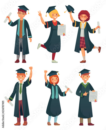 Graduates students. College student in graduation gowns, educated university graduating man and woman characters cartoon vector set