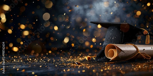 Graduation Cap and Diploma Amidst Sparkling Celebration Lights
