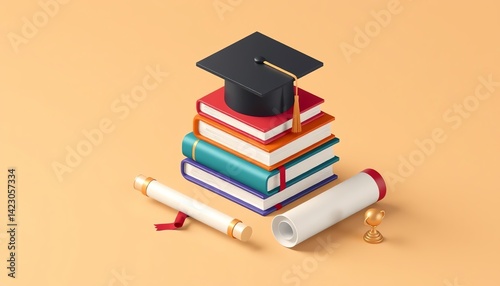 Graduation Cap on Stack of Books with Diploma and Award Education Success Concept