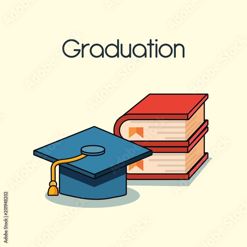 graduation design with graduation cap and stak of books over yellow background, colorful design. vector illustration