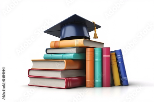 "Graduation Pile: A vibrant collection of books crowned by a mortarboard cap, symbolizing academic achievement and higher education. conveying the importance of knowledge, learning.