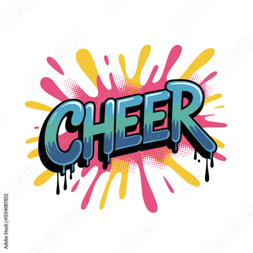Graffiti cheer text with paint splash, Vibrant graffiti-style "CHEER" word art with dripping blue letters and colorful spray paint splash