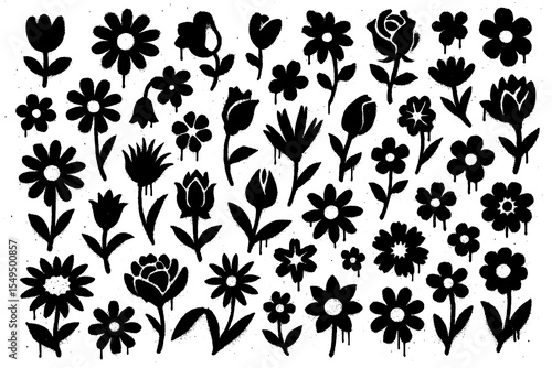 Graffiti Flower Icons – Black Spray Paint Botanical Symbols Set