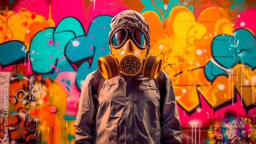 graffiti sprayer artist with mask in a colourful scene. Generative AI