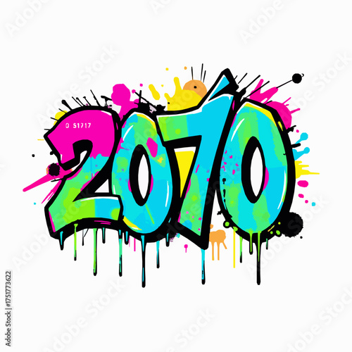 Graffiti style year 2070 with vibrant neon colors and paint splatters numbers text