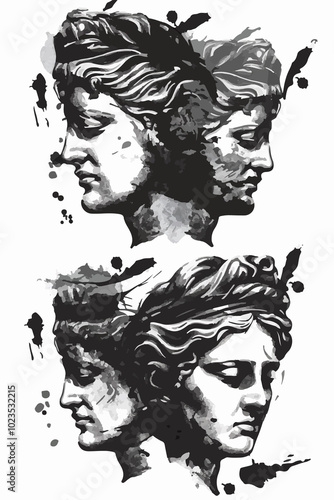 Graffiti-style ink splash art featuring royal busts and crowns. Black and white modern interpretation of classical royalty, displaying power, elegance, and a bold, edgy twist on traditional symbols.
