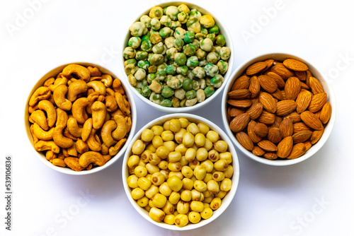 Grains in white bowl such as lotus seeds,almond,cashew and pea are producing plant,commercial grain crops are cereals and legumes.Grains well suited to industrial agriculture for milled,flour,oil.