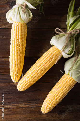 Grains of ripe corn on wooden background. Corn cob and green leaves on wooden background, food Top viev, Copyspace