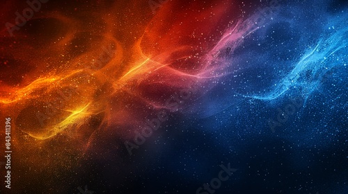 Grainy gradient blend of blue, red, yellow, abstract glowing wave, black backdrop, noise texture banner design, vibrant colors