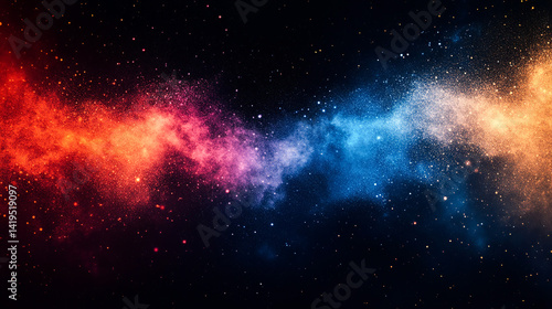 Grainy noise texture backdrop, vibrant glowing blue, red, orange abstract gradient shapes on black. Dark banner, poster, header, cover, wallpaper design