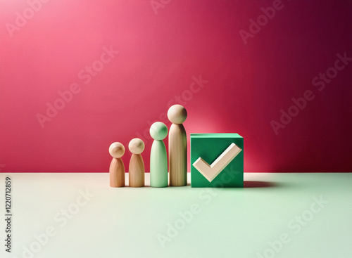 Grainy textured image of wooden figurines in ascending size, next to a green checkmark box. Representing growth, progress, or completion.