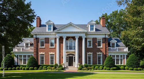 Grand Brick Mansion, Classic Architecture, Lush Landscaping.