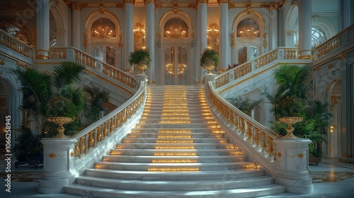 Grand entryway staircase with marble steps, plush carpeting, and gold railing.