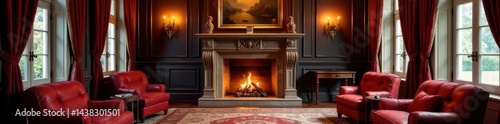Grand fireplace, ornate moldings, plush seating, living room, high ceilings, gold