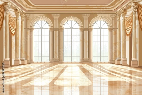 Grand hall with large windows in palace or castle, surrounded by lush greenery