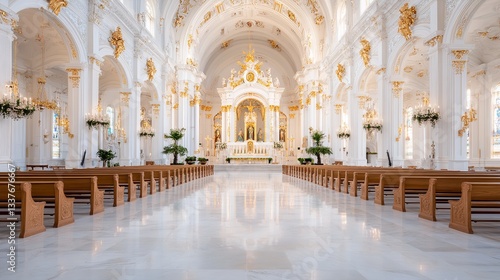 Grand interior of a historic church showcasing intricate architecture and elegant decor in bright daylight