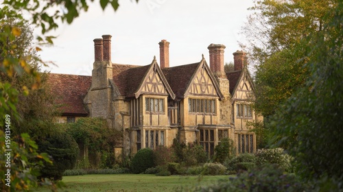 Grand Manor House in Lush Greenery: An impressive and historic manor house, featuring intricate architectural details, stands proudly amidst verdant landscaping.
