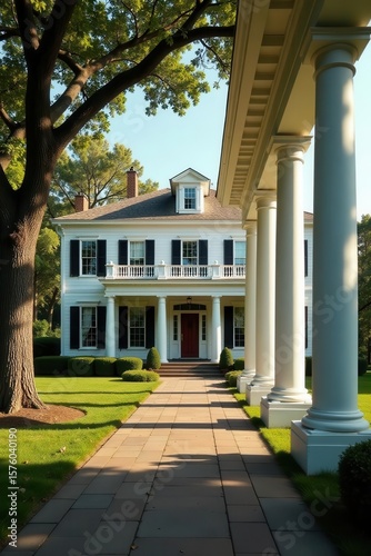 Grand Southern mansion, wide wraparound porch, classic columns, historic, wood, traditional