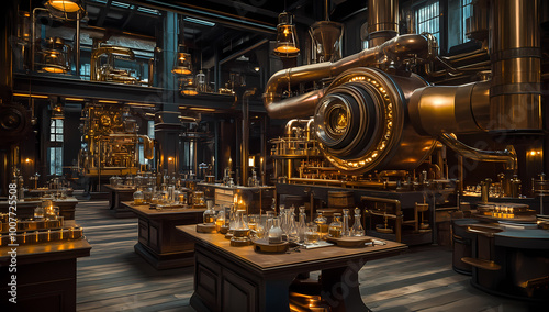 Grand steampunk laboratory with brass pipes and vintage beakers