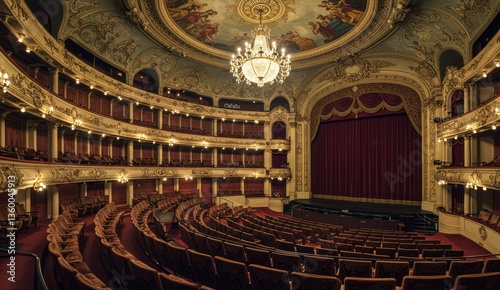 Grand theater interior featuring rows of seats and a majestic chandelier.