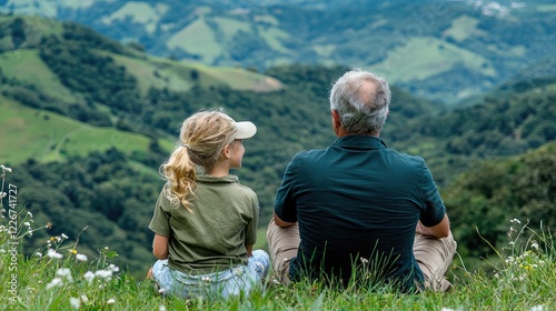 Grandfather and granddaughter enjoy mountain view, scenic travel