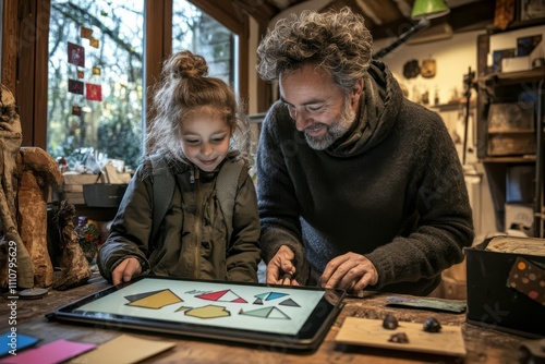 Grandfather and Granddaughter Using Tablet to Learn Shapes in Workshop