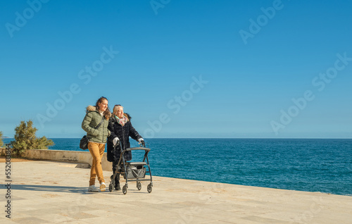 Grandmother and granddaughter walking along seashore