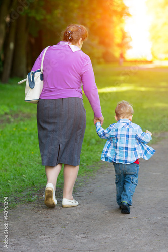 Grandmother walking with her grandson by the hand in the park.